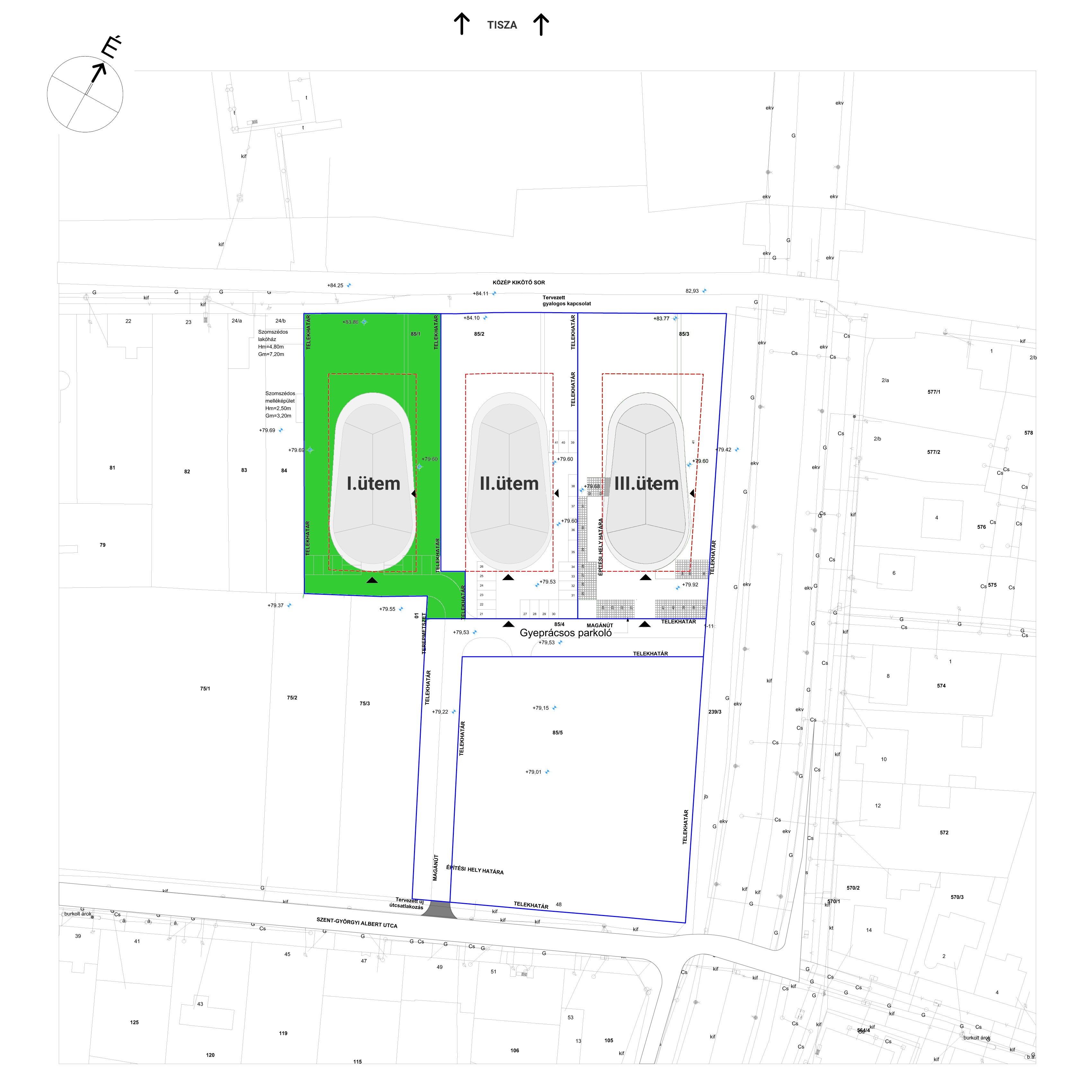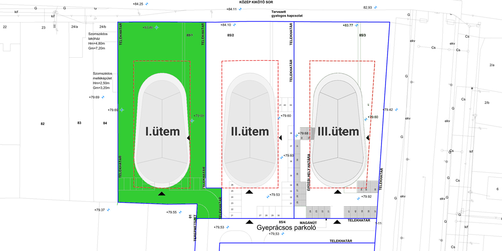 Az első ütem egy 2787 nm nagyságú területen helyezkedik el a lakópark területének nyugati oldalán, körbe kerített saját zárt udvarral.